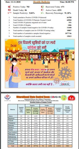शाम छह बजे जारी किए गए हेल्थ बुलेटिन के अनुसार आज कोरोना संक्रमण से छह लोगों की मौत हुई, अब तक राज्य में कोरोना संक्रमण से 1086 लोगों की मौत हो चुकी है। 60900 लोग अब तक कोरोना संक्रमण की जंग में जीत कर स्वस्थ हो चुके है। आज 471 लोग विभिन्न अस्पतालों से स्वस्थ होकर अपने घरों को गए। राज्य में अब एक्टिव कोरोना संक्रमितों की संख्या 4251 है। राज्य में रिकवरी रेट थोड़ा गिरा है, जो 91.18 प्रतिशत है। 15833 सैंपल जांच रिपोर्ट आने के लिए विभिन्न लैब में इंतजार कर रहे हैं।