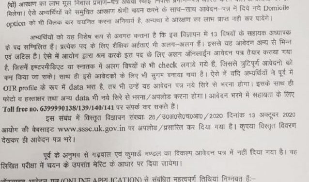 देहरादून। अधीनस्थ सेवा चयन आयोग ने सहायक अध्यापक एलटी के 1431 पदों की भर्ती के लिए विज्ञापन जारी किया गया है। माध्यमिक शिक्षा विभाग के अंतर्गत कुमाउं तथा गढ़वाल दोनों मंडलों के लिए ये पद भरे जाने हैं। इन पदों के लिए आन लाइन आवेदन पत्र आमंत्रित किए गए हैं।