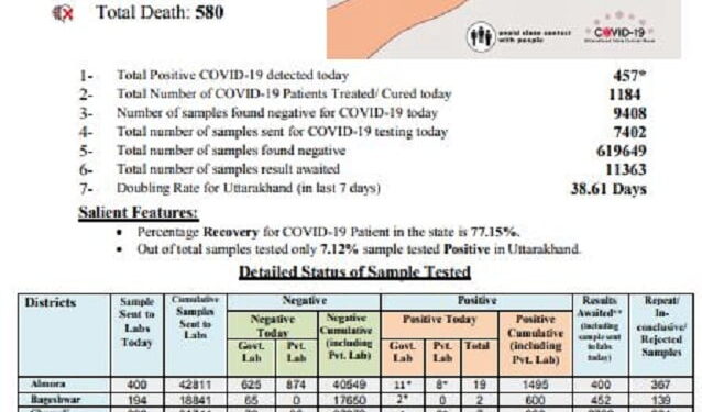 देहरादून। एक लंबे अंतराल के बाद उत्तराखंड में एक दिन में संक्रमण पांच सौ के स्तर से नीचे आया है। आज एक दिन में 457 लोग संक्रमित हुए हैं। राज्य में कुल आंकड़ा 47502 पहुंच गया है। राज्य में आज कोरोना से छह लोगों की मौत हुई है। अब तक 580 लोग कोरोना की वजह से अपनी जान गंवा चुके हैं।