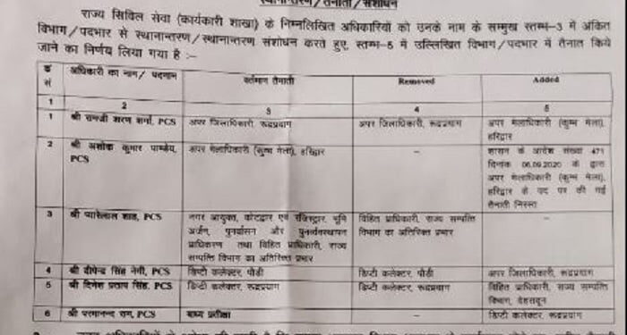 कार्मिक विभाग द्वारा जारी विज्ञप्ति के अनुसार पीसीएस अधिकारी अपर जिलाधिकारी रुद्रप्रयाग रामजी शरण शर्मा अपर मेलाधिकारी कुंभ मेला हरिद्वार स्थानांतरित किया गया है। पीसीएस अधिकारी अशोक कुमार पांडेय जो अपर मेलाधिकारी कुंभ मेला हरिद्वार के पद पर कार्यरत थे, उनकी अपर मेलाधिकारी कुंभ मेला हरिद्वार पर की गई तैनाती को निरस्त किया गया है।