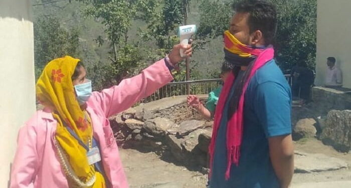 कोरोना संक्रमण की जाँच करती आशा कार्यकर्ती।