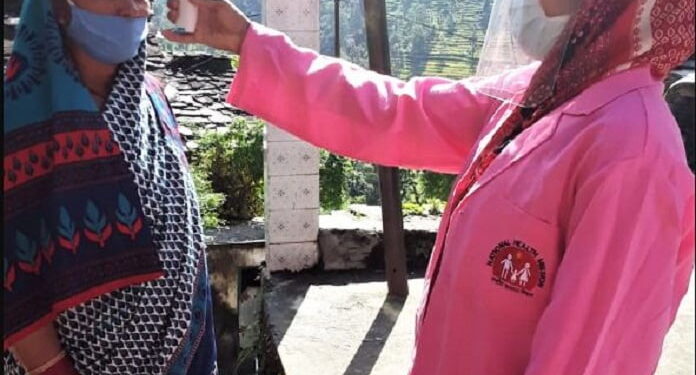 फोटो..कोरोना संक्रमण की नियमित जाँच करती आशा कार्यकर्ती।