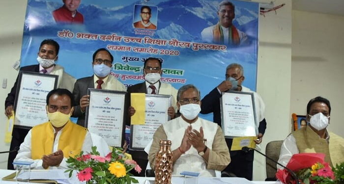 देहरादून। मुख्यमंत्री श्री त्रिवेन्द्र सिंह रावत ने दून विश्वविद्यालय में उच्च शिक्षा के क्षेत्र में उत्कृष्ट योगदान देने वाले चार शिक्षकों को ‘‘डाॅ. भक्त दर्शन उच्च शिक्षा गौरव पुरस्कार-2020’’ से सम्मानित किया। जिन चार शिक्षकों को सम्मानित किया गया उनमें राजकीय स्नातकोत्तर महाविद्यालय के प्राचार्य डाॅ. मोहन चन्द्र पाण्डेय को वाणिज्य एवं प्रबंधन के क्षेत्र में, एम.बी काॅलेज हल्द्वानी के एसोसिएट प्रोफेसर डाॅ. शिव दत्त तिवारी को वनस्पति विज्ञान के क्षेत्र में, पं. ललित मोहन शर्मा राजकीय स्नातकोत्तर महाविद्यालय ऋषिकेश के प्रो. (डाॅ.) सतेन्द्र कुमार को साहित्य के क्षेत्र में एवं प्रो. डाॅ. संजय कुमार को इतिहास के क्षेत्र में उल्लेखनीय योगदान के लिए यह पुरस्कार प्रदान किया गया।