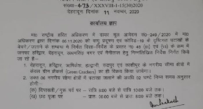 देहरादून। उत्तराखंड के छह मैदानी शहरों में सिर्फ दो घंटे ग्रीन पटाखे जलाए जा सकेंगे। हरित प्राधिकरण के अनुसार वायु प्रदूषण तथा कोविड-19 को देखते हुए यह निर्णय किया गया है। प्रतिबंधित शहर हैं-देहरादून, हरिद्वार, ऋषिकेश, रूद्रपुर, काशीपुर, हल्द्वानी शामिल हैं।