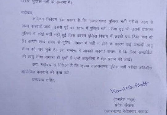 इस दौरान कमलेश भट्ट ने पुलिस महानिरीक्षक कार्मिक को ज्ञापन सौंपकर पुलिस भर्ती को जल्द शुरू करवाने से लेकर आयु में छूट को बढ़ाने की मांग रखी। राज्य में पिछले छह साल से पुलिस भर्ती नहीं हुई है। कई अभ्यर्थी ऐसे हैं जो बिना पुलिस भर्ती के अवसर प्राप्त किए ओवरएज हो चुके हैं। उनको पुलिस भर्ती का अवसर कभी प्राप्त नहीं हुआ तो कमलेश भट्ट जी ने उन सभी अभ्यर्थियों की पीड़ा को समझते हुए पुलिस महा निरीक्षक को अवगत करवाया और ज्ञापन देकर इस पर विचार विमर्श करने के लिए कहा गया, ताकि सभी अभ्यर्थी इस अवसर का लाभ उठा सकें।