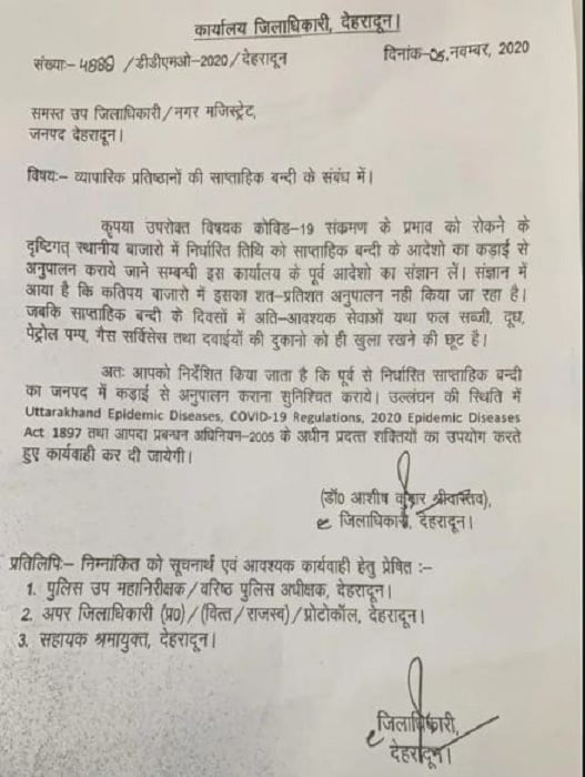 देहरादून। जिलाधिकारी डा.आशीष कुमार श्रीवास्तव ने सभी उपजिलाधिकारियों तथा नगर मजिस्टेटों को निर्देश दिया है कि कोविड पर नियंत्रण बनाए रखने के लिए बाजारों के साप्ताहिक बंदी का कड़ाई से पालन करवाया जाए।