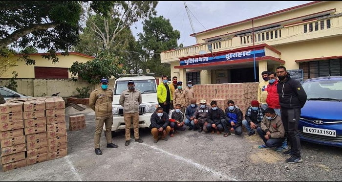 दिनांक 08 दिसंबर 2020 को द्वाराहाट थाना मे पंजीकृत उक्त घटना में गायब हुयी 450 पेटी अंग्रजी शराब की बरामदगी एवं फरार अभियुक्त विजय जोशी की तत्काल गिरफ्तारी हेतु पुलिस महानिदेशक अशोक कुमार के निर्देश पर कार्यवाहक एस0एस0पी0 अल्मोड़ा आयुष अग्रवाल के निर्देश पर पुलिस उपाधीक्षक अल्मोड़ा वीर सिंह’ के पर्यवेक्षण में एसओजी प्रभारी उ0नि0 नीरज भाकुनी के नेतृत्व में मय विवेचक उ0नि0 गौरव जोशी, उ0नि0 सुनील धनिक प्रभारी चौकी मासी उ0नि0 भूपेन्द्र सिंह मेहता प्रभारी चौकी खीड़ा थाना चौखुटिया, द्वाराहाट एवं एसओजी/साइबर की पुलिस टीम गठित करते हुए घटना के अनावरण एवं तत्काल माल की बरामदगी हेतु निर्देश दिये गये। एस0एस0पी0 अल्मोडा द्वारा सम्पूर्ण घटनाक्रम का स्वंय सूक्ष्म पर्यवेक्षण करते हुए टीम को दिशा निर्देश दिये गये। इसी क्रम में पुलिस टीम द्वारा फरार अभियुक्त विजय जोशी के मोबाईल नम्बर एवं वाहन के जी0पी0एस लोकेशन का गहन परीक्षण करते हुए दिनाँक 02 दिसंबर 2020 एवं 03 दिसंबर 2020 को वाहन के गैरसैंण में अलग अलग स्थान पर काफी देर तक रूके होने के तथ्य के आधार पर जाँच को आगे बढ़ाया एवं अभियुक्त विजय जोशी के लगातार राजेन्द्र सिंह उर्फ राजू एवं अनिल पंवार के सम्पर्क में होना पाया गया। जानकारी करने पर ज्ञात हुआ कि राजेन्द्र सिंह उर्फ राजू गैरसैण, मैयथान, गोचर चमोली के सरकारी अंग्रेजी शराब के ठेके चलाता है। जिसके आधार पर उक्त व्यक्तियों की तलाश तेज की गयी, लेकिन उक्त व्यक्ति फरार थे। एसओजी/साईबर प्रभारी नीरज भाकुनी एवं साईबर सैल में नियुक्त उ0नि0 मोहन सिंह सोन द्वारा समस्त संदिग्धों के मोबाईल नम्बरों का गहन विश्लेषण किया गया तो अन्य व्यक्तियों की भी संदिग्ध गतिविधि परिलक्षित हुयी। जिसके आधार पर उक्त व्यक्तियों की तलाश तेज की गयी। दिनाँक 10 दिसंबर 2020 को राजेन्द्र सिंह उर्फ राजू के करीबी कमल सिंह को पकड़कर पूछताछ की गयी तो उसके द्वारा बताया गया कि विजय जोशी द्वारा ट्रक में रखे सम्पूर्ण माल को राजेन्द्रसिंह राजू को बेच दिया था और राजू ने उक्त माल को अलग.अलग स्थान में छुपाकर रखा हुआ है। उक्त सूचना के आधार पर ग्राम सुगड़ में दबिश दी गयी, जहाँ पर अभियुक्त अनिल, बलवन्त सिंह एंव गोविन्द सिंह को मय ईआन कार के गिरफ्तार कर प्रथम बरामदगी की गयी।