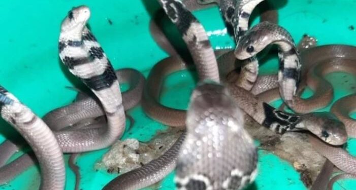 देहरादून के बंजारावाला में एक दुकान में अचानक फर्श के नीचे से एक के बाद एक 12 कोबरा सांप निकल आये, जिससे अफरा-तफरी मच गई। सूचना के अनुसार, बंजारावाला निवासी सुमित कुमार की घर में ही इलेक्ट्रीशियन की दुकान है। सुमित गुरुवार को दुकान पर बैठे थे। उन्होंने देखा कि कच्चे फर्श में गड्ढे से सांप का बच्चा बाहर निकला। देखते-देखते दो सांप बाहर निकल आए। जब तक सुमित कुछ समझ पाते एक साथ कई सांप बाहर निकल आये, दरअसल, ये कोबरा के बच्चे थे, जो हाल ही में पैदा हुए होंगे। लोगों ने आनन-फानन में वन विभाग की टीम को सूचना दी, मौके पर पहुंची वन विभाग की रेस्क्यू टीम ने कोबरा के 12 बच्चों को दुकान से बाहर निकाला। बाद में वन विभाग की टीम ने उन्हें सुरक्षित जंगल में छोड़ दिया।