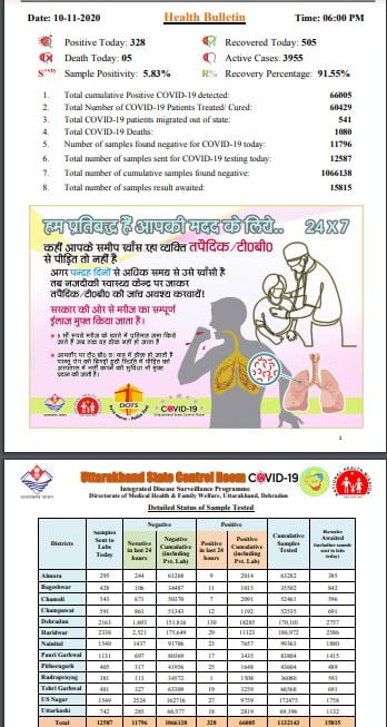 शाम छह बजे जारी किए गए हेल्थ बुलेटिन के अनुसार विभिन्न अस्पतालों से 505 कोरोना संक्रमित ठीक होकर अपने घरों को लौटे। अब तक राज्य में 60429 लोग कोरोना की जंग जीतकर स्वस्थ हो चुके हैं। राज्य में एक्टिव कोरोना मरीजों का आंकड़ा 3955 तक पहुंचा है। रिकवरी रेट थोड़ा बढ़कर 91.55 प्रतिशत तक पहुंचा है। 15815 सैंपल विभिन्न लैब में जांच रिपोर्ट आने का इंतजार कर रहे हैं।