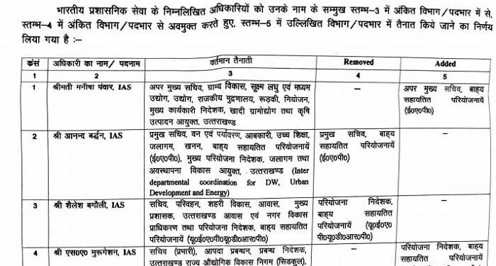 देहरादून। कार्मिक एवं सतर्कता विभाग द्वारा जारी आदेश के अनुसार दो आईएएस अफसरों के तबादले किए गए हैं, जबकि पांच के विभागों में फेरबदल किया गया है।