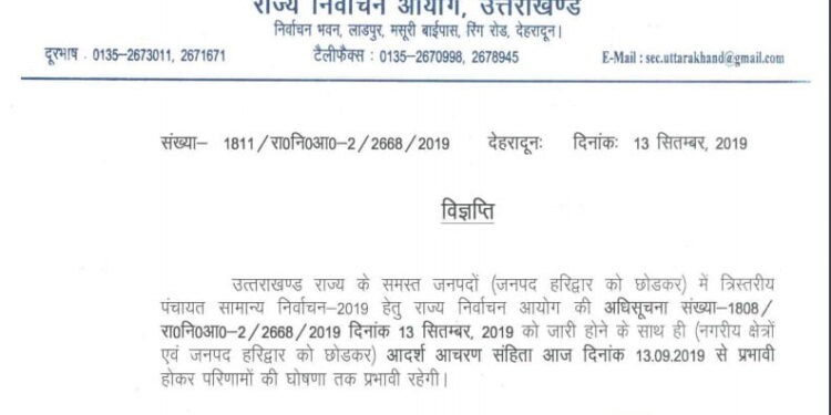देहरादून। उत्तराखंड के बारह जिलों में होने वाले पंचायत चुनाव की अधिसूचना जारी कर दी गई है। पंचायत चुनाव तीन चरणों में होंगे। छोटी सरकार चुनने के लिए होने वाले इस चुनाव में ग्राम पंचायतों के सदस्य, ग्राम प्रधान, क्षेत्र पंचायत सदस्य और जिला पंचायत सदस्य चुने जाएंगे। नामांकन 20 सितंबर से 24 सितंबर तक किए जाएंगे, 22 सितंबर को अवकाश रहेगा। 25 से 27 सितंबर तक नामांकन पत्रों की जांच होगी। 28 सितंबर को नाम वापस लिए जा सकेंगे। 29 सितंबर को चुनाव चिन्ह आंटित होंगे। दूसरे चक्र के चुनाव चिन्ह 4 अक्टूबर को आवंटित होंगे। तीसरे चक्र के चुनाव चिन्ह 9 अक्टूबर को आवंटित होंगे। पहले चरण का मतदान 6 अक्टूबर को होगा, दूसरे चरण का मतदान 11 अक्टूबर को और तीसरे चरण का मतदान 16 अक्टूबर को होगा। 21 अक्टूबर को मतगणना होगी और चुनाव परिणाम घोषित किया जाएगा।