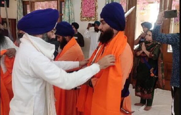 फ़ोटो.पंचप्यारों को सरोपा भेंट करते मुख्य प्रबंधक सेवा सिंह।