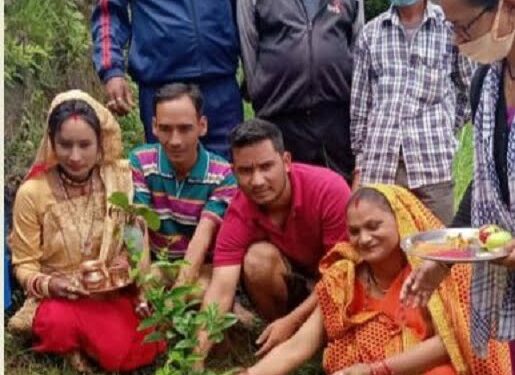 गांव के अराध्य नारायण मंदिर परिसर में आंगनबाड़ी कार्यकर्ती की प्रेरणा से नव दंपतियों ने फलदार वृक्षों का रोपण किया । इस अवसर पर सभी ग्रामीणों ने गांव में दुल्हन आने पर वृक्षारोपण करने का संकल्प लिया। ग्रामीणों ने नव युगल सरीता .राकेश सिंह और रामेश्वरी भरत सिंह को शुभकामनाएं दी और गांव में नयी परंपरा की शुरूवात करने पर अंजना रावत का धन्यवाद किया। इस दौरान आंगनबाड़ी कार्यकर्ती अंजना रावत, एएनएम विमला आर्य, आशा सुमन जुयाल, सावित्री देवी, खुसाल सिंह, मेहरवान सिंह, विजय सिंह, गीता देवी, महेशी देवी, छुमा, विमला, नीरू, आरती, हेमंती देवी आदि ग्रामीण मौजूद रहे।