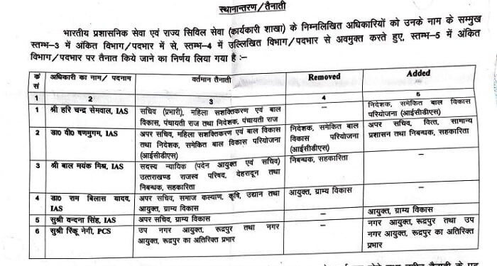 देहरादून। कार्मिक एवं सतर्कता विभाग के आदेश के अनुसार पांच आईएएस एवं एक पीसीएस अधिकारी का स्थानांतरण/तैनाती में बदलाव किया गया है। आईएएस अधिकारी प्रभारी सचिव हरि चंद्र सेमवाल निदेशक समेकित बाल विकास परियोजना आईसीडीएस की अतिरिक्त जिम्मेदारी सौंपी गई है।