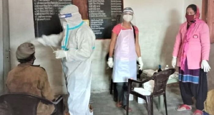 फोटो..कोविड संक्रमण की जाँच करते स्वास्थ्य कर्मी।