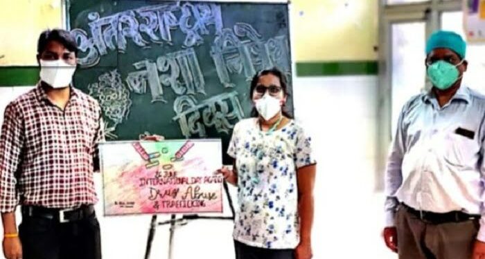 नशा दिवस पर स्वास्थ्य कर्मी नशे के खिलाफ संदेश देते हुए