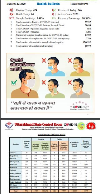 देहरादून। राज्य में आज 424 कोरोना संक्रमित चिन्हित किए गए। राज्य में इसके साथ ही संक्रमितों का आंकड़ा 77997 पहुंच गया है। कोरोना से आज राज्य में चार लोगों की मौत हुई, अब तक राज्य में कोरोना से 1285 लोगों की मौत हो चुकी है।