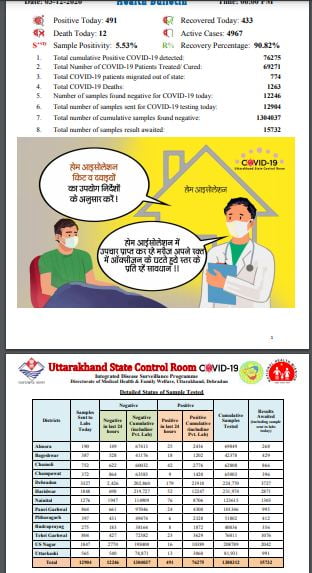 देहरादून। राज्य में आज 491 कोरोना संक्रमित चिन्हित किए गए। इसकी वजह से राज्य में संक्रमण का आंकड़ा 76275 पहुंच गया है। राज्य में आज 12 कोरोना संक्रमितों की मौत हो गई, अब तक राज्य में 1263 लोग कोरोना की वजह से अपनी जान गंवा चुके हैं।