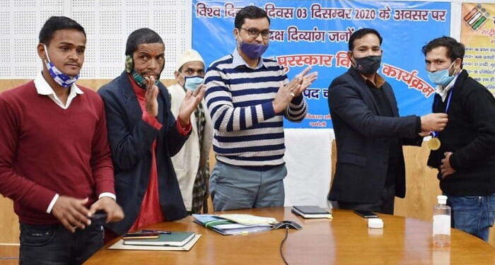 विश्व दिव्यांग दिवस के अवसर वीडियों काॅन्फ्रेसिंग के माध्यम से आयोजित कार्यक्रम में समाज कल्याण एवं परिवहन मंत्री यशपाल आर्या ने सभी जनपदों के दक्ष दिव्यांग जनों को पुरस्कार प्रदान किए। क्लेक्ट्रेट परिसर के एनआईसी हाॅल में अपर जिलाधिकारी अनिल कुमार चन्याल ने मा0 मंत्री की ओर से जिले के दक्ष दिव्यांग खिलाडी विक्रम सिंह को मैडल, प्रशस्ति पत्र एवं पुरस्कार धनराशि का चैक प्रदान कर सम्मानित किया। विश्व दिव्यांग दिवस पर पूरे राज्य में दक्ष दिव्यांग खिलाडी, दक्ष दिव्यांग कर्मचारी एवं स्वरोजगार से जुड़े 54 दक्ष दिव्यांगजनों को राज्य स्तरीय पुरस्कार देकर सम्मानित किया गया।