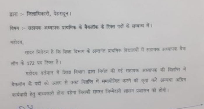 नवक्रांति स्वराज मोर्चा के सचिव एडवोकेट गंभीर सिंह चैहान ने शिक्षा सचिव को लिखे पत्र में कहा है कि शिक्षा विभाग के अंतर्गत प्राथमिक विद्यालयों में बैक लाग के 172 पद रिक्त हैं। शिक्षा विभाग द्वारा निर्गत की गई सहायक अध्यापक की विज्ञप्ति में बैकलाग के पदों को अलग से उक्त विज्ञप्ति में समायोजित करने का आग्रह किया है। साथ ही चेतावनी दी गई है कि ऐसा नहीं किया गया तो आंदोलन के लिए वाद्य होना पड़ेगा। शिक्षा विभाग इसके लिए जिम्मेदार होगा।