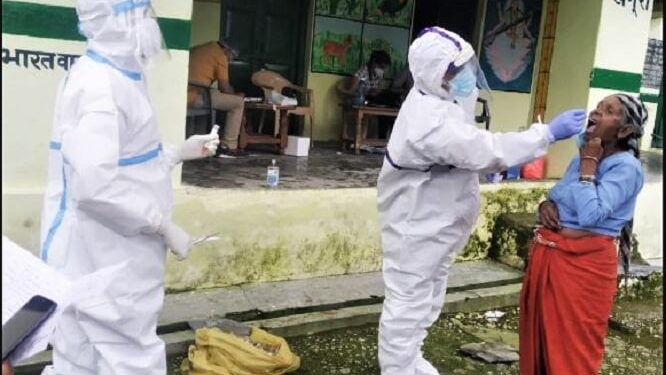 फोटो-कोरोना संक्रमण की जाँच करते स्वास्थ्य कर्मी।