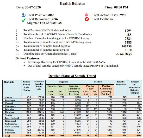 देहरादून। राज्य में आज 199 संक्रमित चिन्हित हुए। राज्य में संक्रमितों का आंकड़ा 7065 तक पहुंच गया है। जिस गति से राज्य में कोरोना संक्रमितों की संख्या सात हजार को पार कर गई है, उससे यह चिंता सताने लगी है कि इस ब्रेक लगाना अब आसान नहीं होगा। चार कोरोना संक्रमितों की मौत हुई है।