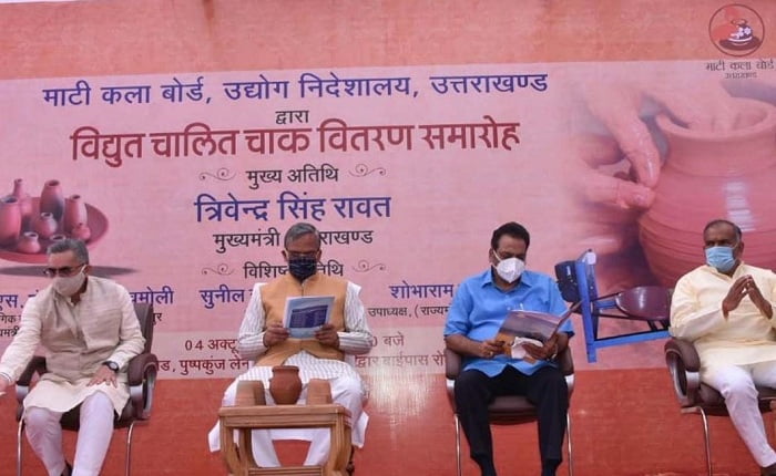 देहरादून। मुख्यमंत्री श्री त्रिवेन्द्र सिंह रावत ने मोथरावाला रोड, स्थित माटी कला बोर्ड कार्यालय में मुख्यमंत्री स्वरोजगार योजना के अन्तर्गत कुम्हारी कला के लिए विद्युत चालित चाक वितरित किये। मुख्यमंत्री श्री त्रिवेन्द्र ने कहा कि माटी कला के लिए प्रदेश में एक प्रशिक्षण केन्द्र खोला जायेगा। माटी कला बोर्ड को मिट्टी गूंथने वाली 200 मशीने दी जायेंगी। उन्होंने कहा कि मिट्टी के कार्यों से जुड़े शिल्पकारों का एक डाटा बेस बनना चाहिए। ऐसे स्थान चिन्हित किये जाय जहां पर इस शिल्प पर आधारित कार्य अधिक हो रहे हैं एवं मिट्टी के उपकरण बनाने के लिए उपयुक्त मिट्टी वाले स्थानों को चिन्हित करना जरूरी है।