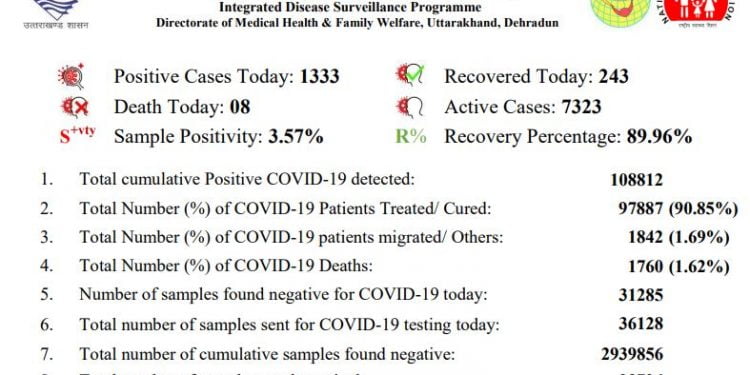 उत्तराखंड में कोरोना एक बार फिर तेजी से बढ़ रहा है। आज 1333 नए मामले सामने आये हैं। प्रदेश में आज 08 मरीजों की मौत की सूचना है। इस तरह प्रदेश में अब तक कुल 108812 लोग कोरोना से संक्रमित हो चुके हैं और 1760 मरीजों की मौत हुई है। प्रदेश में कोरोना के 7323 एक्टिव केस हैं।