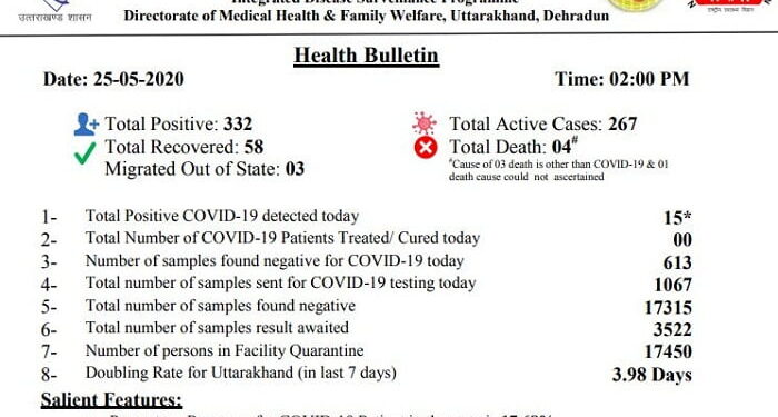 राज्य नियंत्रण कक्ष कोविड-19 द्वारा जारी हेल्थ बुलेटिन के अनुसार राज्य में अब तक 58 लोग स्वस्थ हो चुके हैं। 267 एक्टिव मामले हैं, जबकि कोरोना से राज्य में 4 लोगों की मौत हो गई है। गौरतलब है कि राज्य में कोरोना पाजिटिव बढ़ने की दर इस कदर तेज हो गई है कि 3.98 दिन में पाजिटिव दो गुने हो जा रहे हैं, जबकि आज से करीब 15 दिन पहले दो गुने होने की दर 46 दिन थी। पौड़ी जिले के पाबौ में गाजियाबाद से लौटे एक कोरोना पाजिटिव 48 वर्षीय एक व्यक्ति की मौत हुई है। इस तरह कोरोना से मरने वालों की संख्या 4 हो गई है।