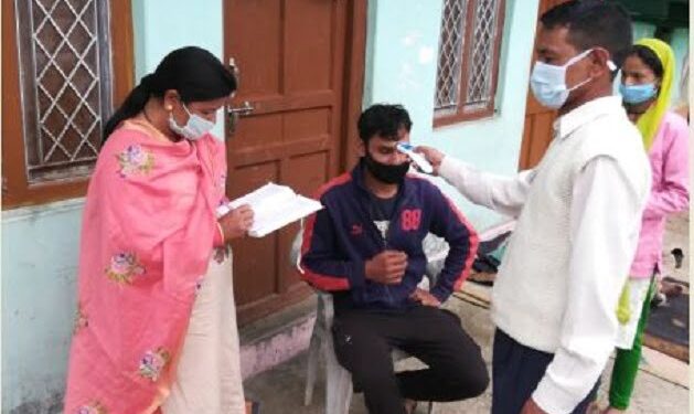 फोटो..होम क्वारेंटाइन किये गए लोगों का स्वास्थ्य परीक्षण करते चिकित्सा टीम।