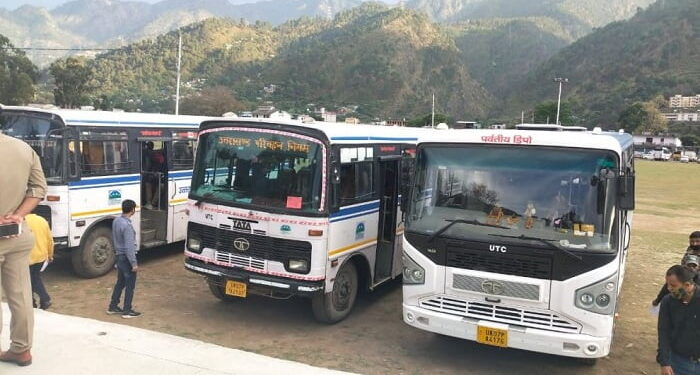 फोटो..परिवहन निगम की बसों से गौचर पहुंच रहे बाहरी प्रदेशों में फंसे लोग।