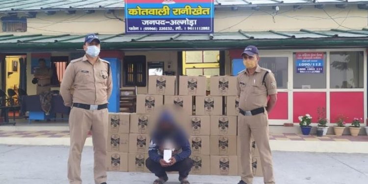 पंकज भट्ट वरिष्ठ पुलिस अधीक्षक अल्मोड़ा के निर्देशानुसार जनपद में अवैध शराब की बिक्री,तस्करी एवं भण्डारण की रोकथाम में कार्यवाही किये जाने के क्रम में 02 अप्रैल 2021 को रानीखेत पुलिस एवं SOG की संयुक्त टीम ने SN श्रीवास्तव अस्पताल को जाने वाले रास्ते पर नूतन बार के नीचे की तरफ बने टिन शेड में 25 पेटी अवैध Mc Dowells whiskey अंग्रेजी शराब के अवैध भंडारण के साथ एक युवक को गिरफ्तार कर आवश्यक वैधानिक कार्यवाही करते हुए कोतवाली रानीखेत में मु0अ0सँ0- 06/21 धारा- 60 आबकरी अधिनियम में अभियोग पंजीकृत किया गया। अभियुक्त से 25 पेटी अंग्रेजी शराब (कीमत करीब 1,68000 रुपये) बरामद किये गए