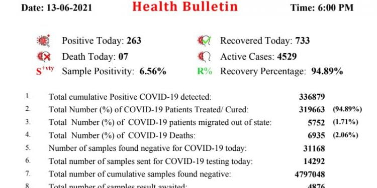 उत्तराखंड में पिछले 24 घंटों में कोरोना के 263 नए मामले सामने आए हैं। सात मरीजों की मौत हुई है और 733 लोग स्वस्थ हुए हैं। शाम 6:00 बजे जारी हेल्थ बुलेटिन के अनुसार, आज अल्मोड़ा में 12, बागेश्वर में 8, चमोली में 11, चंपावत में 11, देहरादून में 67, हरिद्वार में 55, नैनीताल में 23, पौड़ी में 09, पिथौरागढ़ में 05, रुद्रप्रयाग में पांच, टिहरी में 20, ऊधमसिंह नगर में 15 और उत्तरकाशी में 22 मामले सामने आए हैं। प्रदेश में अब 4529 एक्टिव केस हैं और रिकवरी दर बढ़कर 94.89 फीसदी हो गई है।