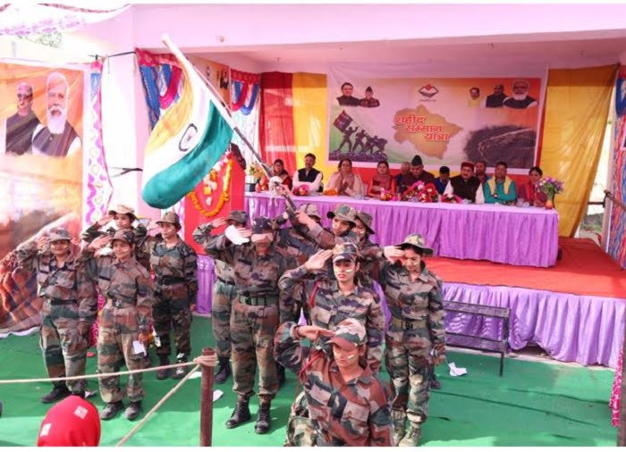 अगस्त्यमुनि के रामलीला मैदान में सैनिक कल्याण विभाग रुद्रप्रयाग द्वारा सैनिक सम्मान यात्रा कार्यक्रम में विकासखंड अगस्त्यमुनि व ऊखीमठ के भारतीय सेना में शहीद हुए 52 सैनिकों के परिजनों को ताम्र पत्र व शॉल ओढ़ाकर मुख्य अतिथि सैनिक कल्याण मंत्री गणेश जोशी द्वारा सम्मानित किया गया। उन्होंने शहीदों को नमन करते हुए कहा कि शहीद सैनिकों के घर.आंगन की मिट्टी को कलश में प्राप्त करते हुए उत्तराखंड के सैनिक शहीद धाम देहरादून में निर्माण कार्य में लगाया जाएगा।