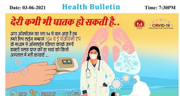 आज देहरादून में 136 और हरिद्वार में 104 लोग संक्रमित हुए। नैनीताल में 75 और उधमसिंह नगर में 70, चमोली में 50, अल्मोड़ा में 46, पिथौरागढ़ में 22, टिहरी और उत्तरकाशी में 21-21, बागेश्वर में 17, रुद्रप्रयाग 13, पौड़ी में 12, चंपावत में 2 लोग संक्रमित हुए। राज्य में आज भी पंद्रह हजार से कम 14506 लोगों को टीकाकरण हुआ।