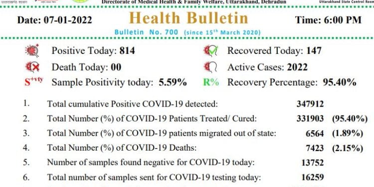 कोरोना संक्रमण का असर राज्य में गहरा होता जा रहा है। राज्य में एक दिन में 814 लोग संक्रमित हुए हैं। इसके साथ ही एक्टिव मामलों की संख्या भी तेजी से बढ़ते हुए 2022 तक पहुंच गई है। यह बात अलग है कि आज राज्य में कोरोना से किसी की मौत नहीं हुई।