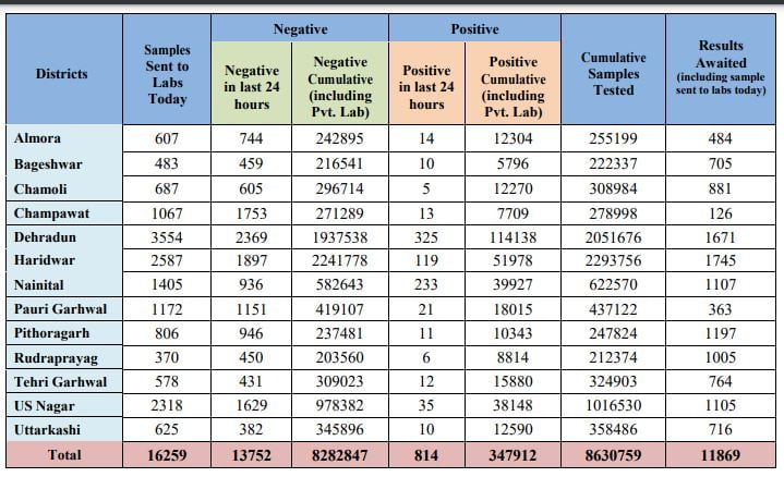 देहरादून। देहरादून तथा नैनीताल जिले में एक साथ कोरोना विस्फोट हुआ है। राज्य में कुल 814 लोग एक दिन में संक्रमित हुए हैं, देहरादून में 325 और नैनीताल में 233 संक्रमित हुए हैं। हरिद्वार में भी 119 लोग संक्रमित हुए हैं।
