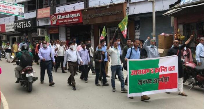 अल्मोड़ा 12अगस्त : आज यहां उत्तराखंड क्रांति दल अल्मोड़ा जिला इकाई द्वारा राज्य में जमीनों की अंधाधुंध खरीद फरोख्त रोके जाने हेतु राज्य में हिमांचल प्रदेश की भांति सशक्त भू कानून बनाये जाने, राज्य की राजधानी गैरसैण में शीघ्र स्थापित किए जाने, राज्य सरकार की नौकरियों के लिए मूल निवास प्रमाणपत्र अनिवार्य किए जाने, राज्य के पिछड़ेपन को देखते हुए राज्य को पिछड़ा क्षेत्र घोषित किये जाने, राज्य में जंगली जानवरों,आवारा पशुओं के आंतक से जनता को मुक्ति दिलाने हेतु प्रभावी कार्यवाही किए जाने तथा किसानों को हो रहे नुकसान हेतु समुचित मुआवजा दिये जाने की मांग को लेकर प्रदर्शन किया तथा अल्मोड़ा शहर में जूलूस निकालकर राज्यपाल एवं मुख्यमंत्री उत्तराखंड को अलग अलग ज्ञापन जिलाधिकारी अल्मोड़ा के माध्यम से प्रेषित किये ।