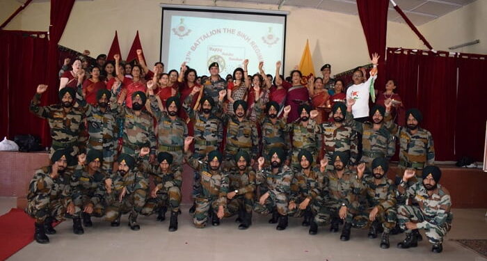 महिला कल्याण संस्था की महिलाओं ने कर्नल हर्ष मिश्रा समेत 13 सिख रेजीमेंट के जवानों को तिलक लगाकर रीति रिवाज के साथ विशेष पूजा अर्चना कर मुॅह मीठा कर राखियाॅ बाॅधी। इस मौके पर जवान भावुक हो गए। जवानों ने बहिनों को देश और उनकी रक्षा करने का वचन दिया। महिलाओं ने कहा कि सेना के जवानों की कलाई में राखी बांधने में उन्हें गर्व हो रहा है। जवानों की बदौलत ही पूरा देश सुरक्षित है। कार्यक्रम की अध्यक्षता करते हुए संस्था की अध्यक्ष रीता दुर्गापाल ने बताया कि संस्था द्वारा देश की सीमाओं में तैनात जवानों के लिए हाल में ही 1008 राखियां भेजीं गई थी। मुख्य अतिथि कमांडिंग आंफिसर कर्नल हर्ष मिश्रा और उनकी धमपत्नी नमीता मिश्रा ने महिला कल्याण संस्था के प्रयासों की सराहना की। इस कार्यक्रम का संचालन पुष्पा सती ने किया। इस मौके पर लेफ्टीनेंट कर्नल मनमोहन सिंह सैनी, लेफ्टीनेंट कर्नल सनी राठी, मेजजर अखिलेश सिंह राठौर, मेजजर अखिलेश सिंह राठौर, शांति साह, कल्पना जोशी, रीता जोशी, अनीता रावत, डॉ. जेसी दुर्गापाल आदि मौजूद थे।