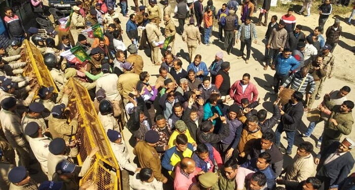 गैरसैँण। सुरक्षा ब्यवस्था को धत्ता बता कर इंद्रेश मैखुरी विधान सभा परिसर के प्रवेश द्वारा धर्मकांटा बैरियर समर्थकों के साथ पहुंचे। बैरियर के पास पहुंच कर उन्होंने विधानसभा की ओर जाने का प्रयास किया तथा जोरदार नारेबाजी की। उनको सुरक्षा बलों द्वारा परिसर में घुसने से रोक दिया गया और जिन्हें हिरासत में लेकर मेहलचौरी अस्थायी जेल में पहुंचाया गया।