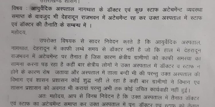 मोर्चा कार्यकर्ताओं ने अनुरोध किया है कि एटेचमेंट व्यवस्था समाप्त कर नागथात में चिकित्सक की नियुक्ति की जाए। पत्र में गंभीर सिंह चैहान तथा गजेंद्र जोशी समेत अन्य के हस्ताक्षर हैं।