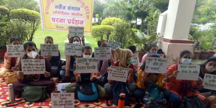 बेरोजगार आयुर्वेदिक नर्सेज द्वारा काफी लंबे समय से0 आयुष एवं आयुष शिक्षा विभाग के अंतर्गत नर्सिंग संवर्ग के पदों में पुनर्गठन किए जाने एवं आयुर्वेदिक नर्सेज के पद सृजित किए जाने की मांग। लेकिन राज्य सरकार के द्वारा आयुर्वेदिक नर्सेज की अनदेखी की जा रही हैं काफी लंबे समय से आयुर्वेदिक नर्सेज बेरोजगार चल रही है । आज रोजगार की मांग के लिए उत्तराखंड डीजी हेल्थ के कार्यालय के बाहर धरना प्रदर्शन को मजबूर है आयुर्वेदिक नर्सेज ।