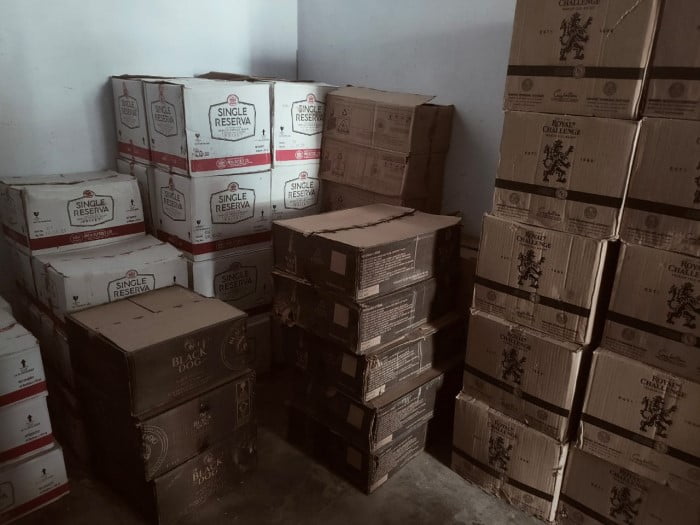 बरामद माल.’ रॉयल चैलेंज, सिग्नेचर, वैट.69, सिंगल रिजर्वा, रॉयल स्टेग, ब्लैग डॉग, ओल्ड वैट, सॉलमेट ब्लू व्हिस्की की कुल 102 पेटी अवैध शराब