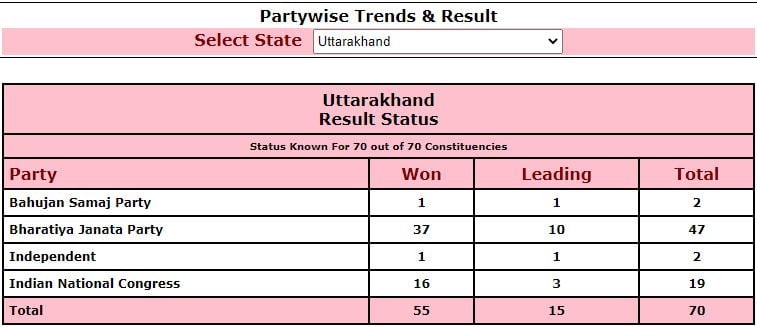 चुनाव आयोग ने अब तक उत्तराखंड में 60 सीटों का रिजल्ट घोषित कर चुका है। जिसमें भाजपा 41, कांग्रेस 17, एक बहुजन समाज पार्टी और एक निर्दलीय प्रत्याशी है। बाकी सीटों में 7 में भाजपा लीड कर रही है, दो पर कांग्रेस, एक पर बहुजन समाज पार्टी और एक पर निर्दलीय लीड कर रहे हैं।