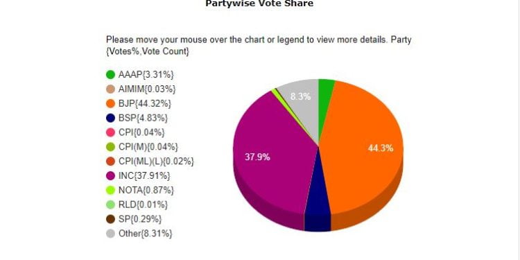 चुनाव आयोग द्वारा जारी की गई सूची के अनुसार जीते और लीड कर रहे प्रत्याशियों में भाजपा 47, कांग्रेस 19, बसपा दो और निर्दलीय शामिल हैं।
