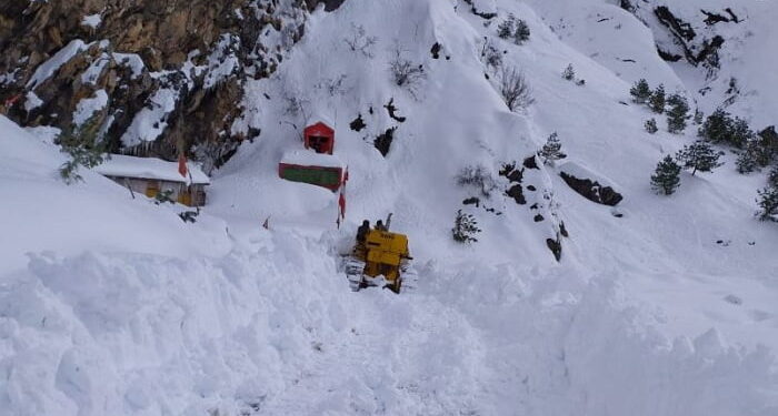 01- बदरीनाथ-माणा हाईवे पर कचंन गंगा के समीप बर्फ हटाता बीआरओ का डोजर।
