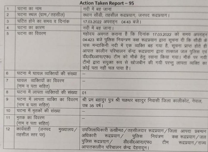 वही जिला आपदा प्रबन्धन अधिकारी नन्दन रजवार ने बताया कि शाम 4.30 बजे के लगभग आपदा प्रबन्धन कंट्रोल रूम में सूचना मिली कि अगस्त्यमुनि के सौड़ी के पास प्रेम बहादूर 35 वर्ष नाम का नेपाली मूल का युवक नदी में बह गया है।