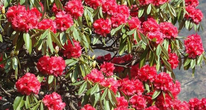 बसंत के शुरुआत से ही बुरांश के पेड़ पर मध्यम आकार के लाल सुर्ख बुरांश खिलने शुरू हो जाते हैं। इसके भीतरी हिस्से में छोटे.छोटे काले धब्बे इसकी खूबसूरती में और ज्यादा निखार ले आते हैं। बुरांश के फूल लाल रंग के अलावा गुलाबी और सफ़ेद रंग के भी हुआ करते हैं। यह भी देखा जा सकता है कि अलग.अलग ऊँचाइयों पर बुरांश लाल से बैंगनी, सफ़ेद रंग तक के बीच की कई रंगतें लिये होता है। 1500 मीटर से लेकर ट्री लाइन तक पनपने वाले इसके पेड़ में इस बदली हुई रंगत को साफ़ देखा जा सकता है। यह अम्लीय मिट्टी में छायादार स्थानों पर पनपने वाला पेड़ है। इसकी मोटी मध्यम आकार की चमकीली पत्तियां गाढ़े हरे रंग की होती हैं। पत्तियों की पिछली सतह चांदी के रंग की होती हैं जिनमें भूरे रोयें चिपके रहते हैंण्