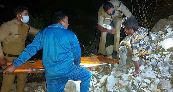 फ़ोटो बस दुर्घटना के घायल चालक को खाई से निकालते हुए।