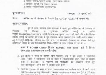 Read moreदेहरादून। राज्य में कोविड कर्फ्यू एक सप्ताह के लिए और बढ़ा दिया है। 20 जुलाई 2021 सुबह 6 बजे तक...
